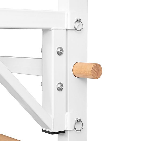 В многих моделях первые две-три ступени имеют специальное антискользящее покрытие с массажным эффектом. Можно к шведской стенке установить тренажер для спины и ног, который улучшает осанку и благотворно влияет на неокрепшие детские мышцы.