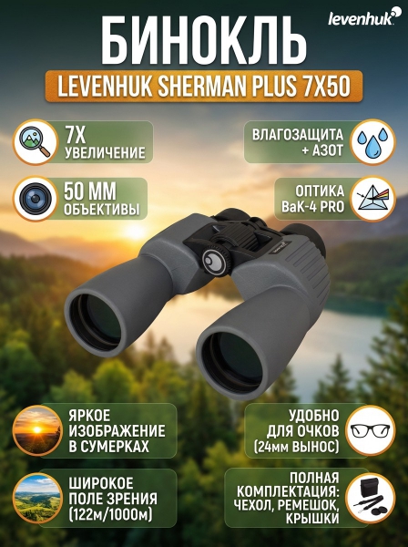 Купить бинокль для туризма и путешествий Levenhuk Sherman PLUS 7x50 по эксклюзивной цене от официального дилера. Профессиональные консультации.