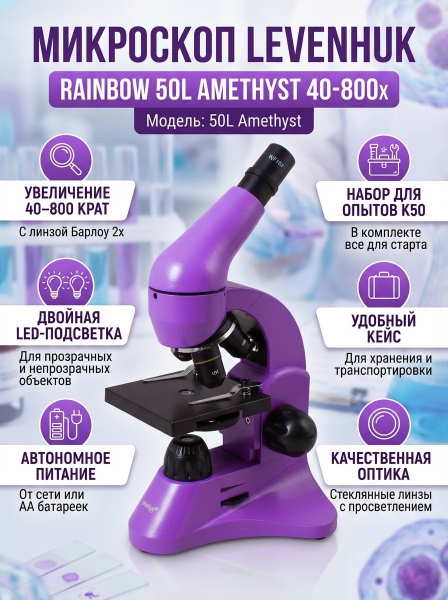 Купить биологический микроскоп Levenhuk Rainbow 50L Amethyst по эксклюзивной цене от официального дилера. Профессиональные консультации.