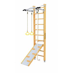 - Функциональность – в процессе оснащения шведской стенки применяются разнообразные спортивные снаряды: турники, гимнастические кольца, канаты, лестницы и прочее. Сбоку можно повесить баскетбольное кольцо, качели, установить горку или закрепить боксерский мешок.