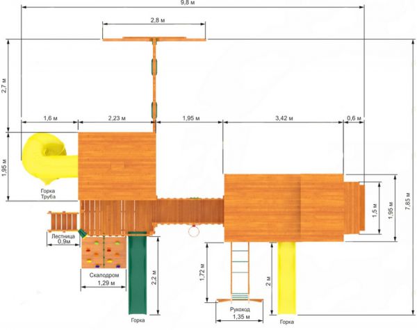 | Особенности: | большие, деревянные, со скалодромом, с домиком, с двумя качелями, с горкой, с рукоходом |