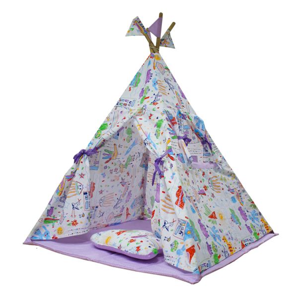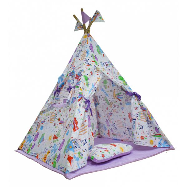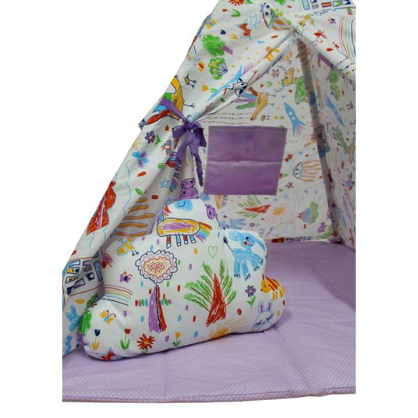 | Комплектация: | тканевый тент-палатка с одним окошком на завязках и карманами на липучках, 4 складные стойки-вигвама с флажками и крепежной бечевкой, мягкий коврик-основание и подушка облако |