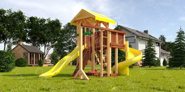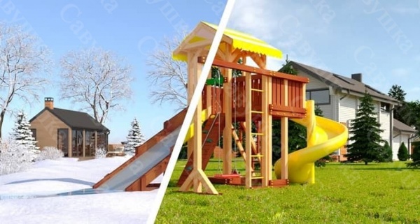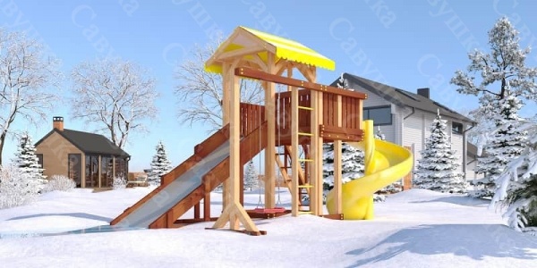 Понравился вариант с 2-мя горками, одна из которых может меняться на ледянку зимой. Конструкция заинтересует детей с разными интересами, здесь уж точно есть чем заняться.