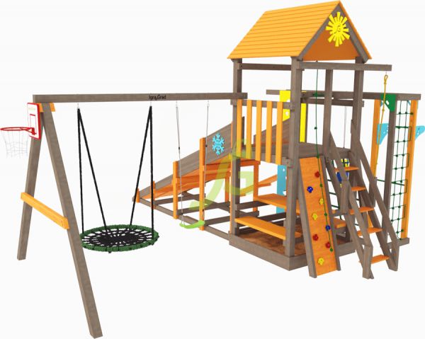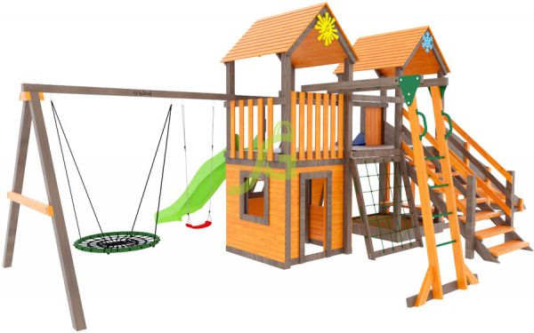 | Особенности: | большие, деревянные, со скалодромом, с баскетбольным кольцом, с гнездом, с горкой, с качелями, с рукоходом |