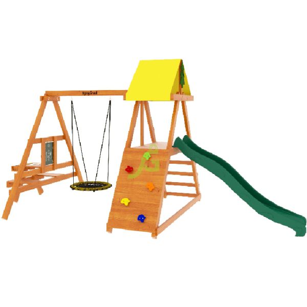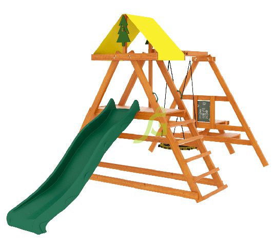 | Комплектация: | конструкция А-образной башни; тентовая крыша; волновая горка 2,2 м; деревянная лестница; скалодром; качельный модуль; качели-гнездо 60 см; детский столик с лавочками; меловая доска для рисования; комплект фурнитуры; руководство по сборке |
