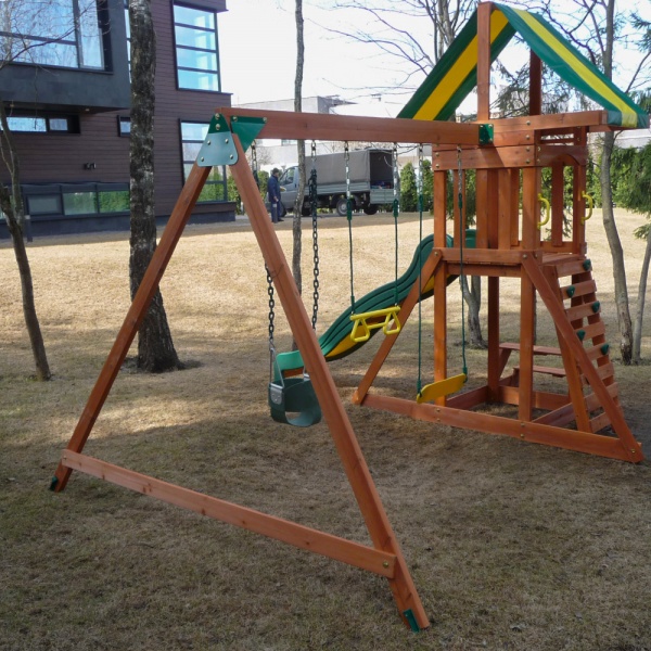| Оптимально подходит как: | деревянные, с домиком, с двумя качелями, с горкой, с качелями, с кольцами, с песочницей |