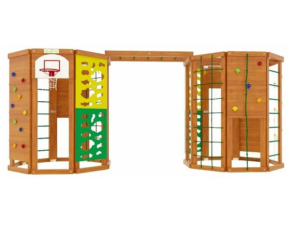 - Спортивные снаряды – в комплекс могут быть включены шведская стенка, турники, гимнастические кольца, канат, веревочная лестница, рукоход, качели, горка и другое. По мере взросления ребенка можно устанавливать дополнительные спортивные снаряды.