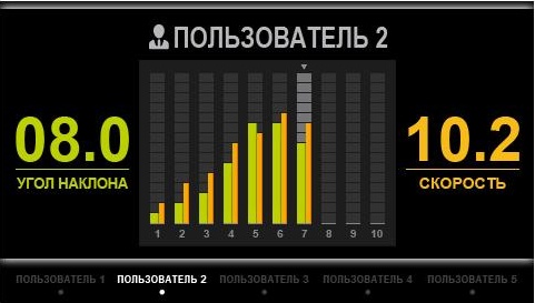 | Показания консоли: | время, скорость, дистанция, пульс, калории, угол наклона |