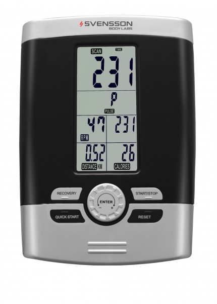 | Показания консоли: | время, дистанция, скорость, калории, обороты в мин., пульс, фитнес-тест (Recovery) |