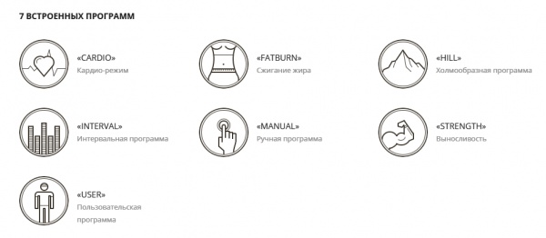 | Спецификация программ: | пользовательские (2), кардио, сжигание жира, холмообразная, интервальная, ручная, выносливость, возможность программирования тренировки |