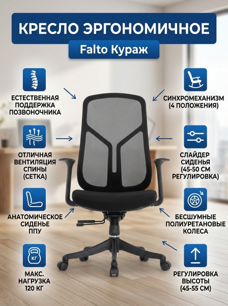 Кресло эргономичное Falto Кураж 210B (обивка/каркас чёрный) - Преимущества
