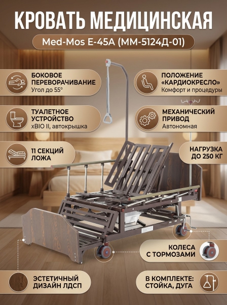Купить функциональную медицинскую кровать Мед-Мос E-45A (ММ-5124Д-01) коричневая по эксклюзивной цене от официального дилера. Профессиональные консультации.