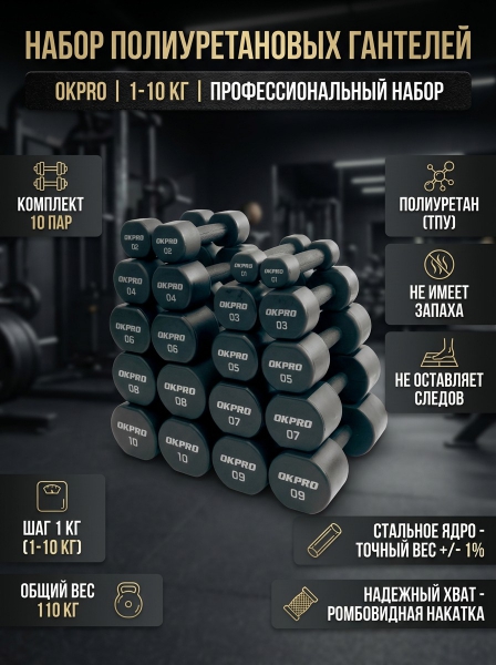 Набор полиуретановых гантелей от 1 до 10 кг OKPRO OK1025C-1-10-G серый лого - Отзывы