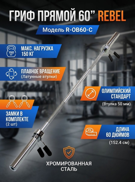 Гриф прямой REBEL 60" хром с замками - Доставка