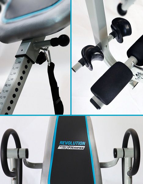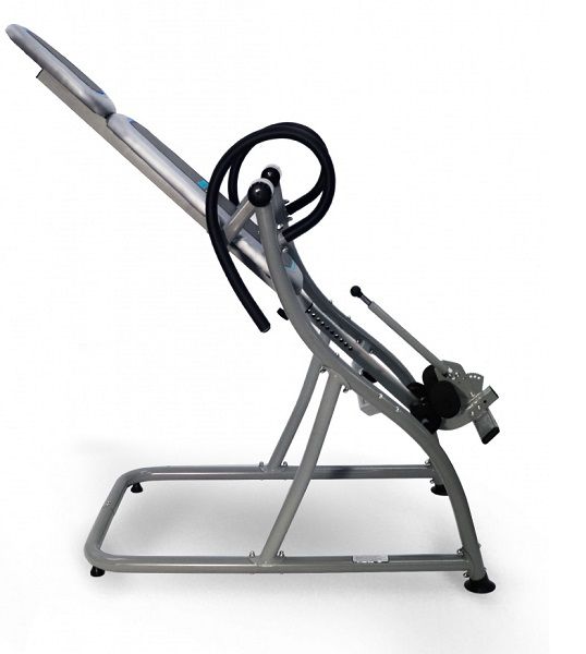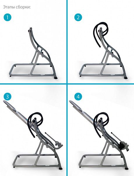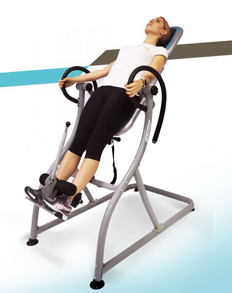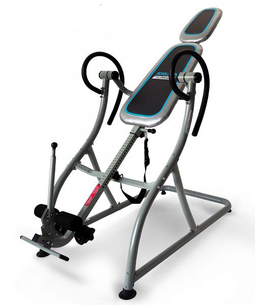 - Инверсионные столы – предназначены для щадящей растяжки позвоночника, а также для снятия болей в спине после изнурительных тренировок. Конструкция представляет собой подвешенную скамью с фиксаторами для обратного виса. Корпус изготовлен из стали, а обивка – из кожи.
