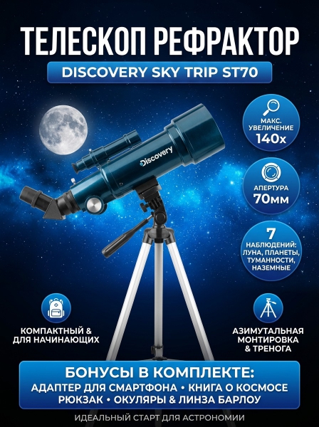 Купить оптический телескоп-рефрактор Discovery Sky Trip ST70 с книгой по эксклюзивной цене от официального дилера. Профессиональные консультации.