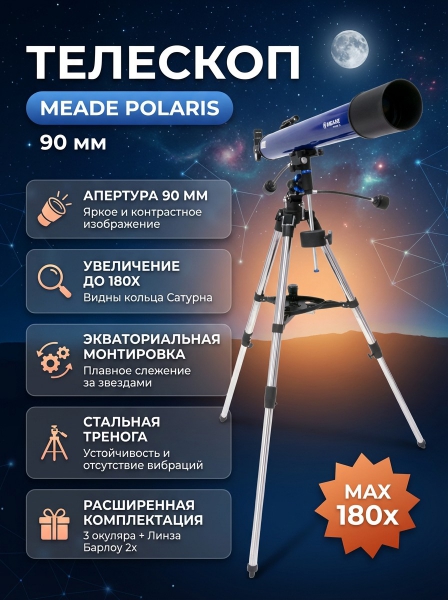 Прочитайте полный обзор, ознакомьтесь с отзывами владельцев Polaris 90 мм, просмотрите описание с характеристиками и фото. Meade - это отличный выбор!
