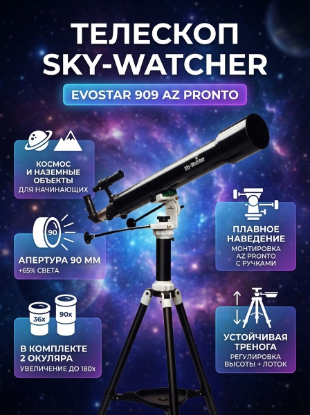 Купить оптический телескоп-рефрактор Sky-Watcher Evostar 909 AZ PRONTO на треноге Star Adventurer по эксклюзивной цене от официального дилера. Профессиональные консультации.