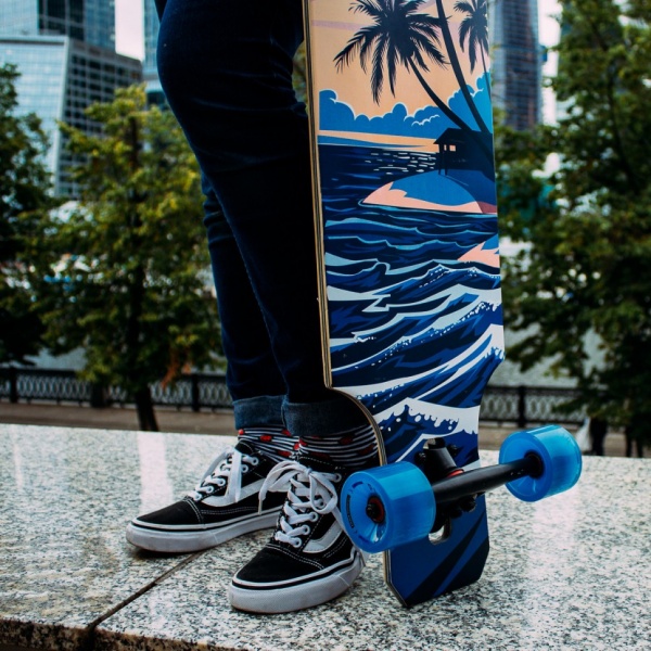 - Скейтборды – в частности, лонгборды. Они являются разновидностью роликовых досок, но благодаря некоторым конструкционным отличиям обладают повышенной устойчивостью и улучшенными ходовыми характеристиками. Способны развивать большую скорость.