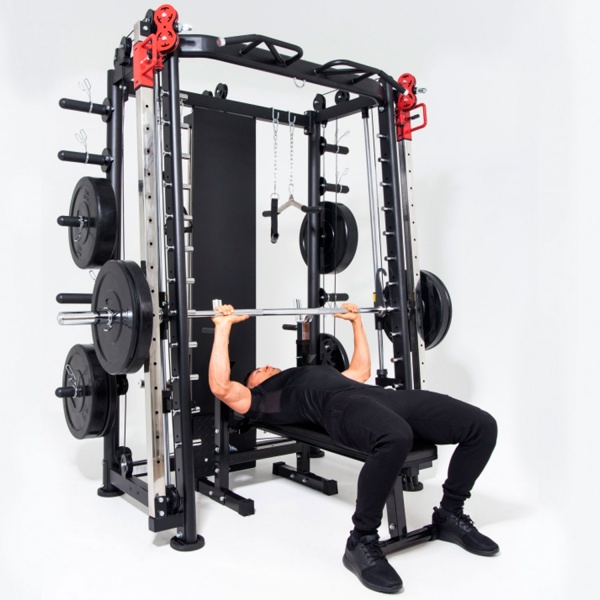 - Мультистанции – многофункциональные тренажеры, которые позволяют спортсмену самостоятельно определять, с какой группой мышц работать. Включают в себя сразу несколько спортивных снарядов и могут комплектоваться дополнительными опциями.