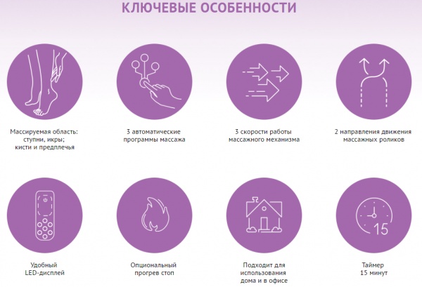| Оптимально подходит как: | электрические, роликовые, шиацу (shiatsu), мини, тепловые с подогревом, для пальцев ног, для стоп и лодыжек, для ступней ног |