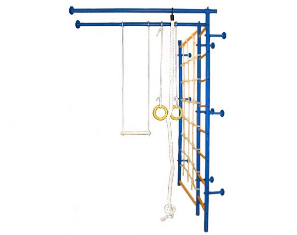 - Функциональность – в процессе оснащения шведской стенки применяются разнообразные спортивные снаряды: турники, гимнастические кольца, канаты, лестницы и прочее. Сбоку можно повесить баскетбольное кольцо, качели, установить горку или закрепить боксерский мешок.