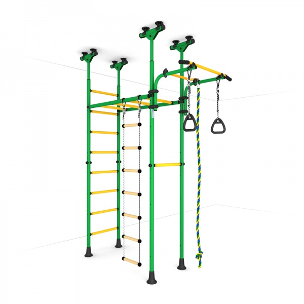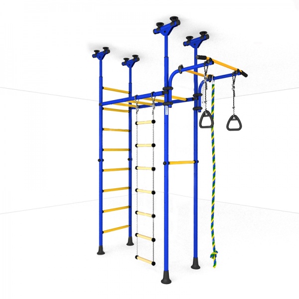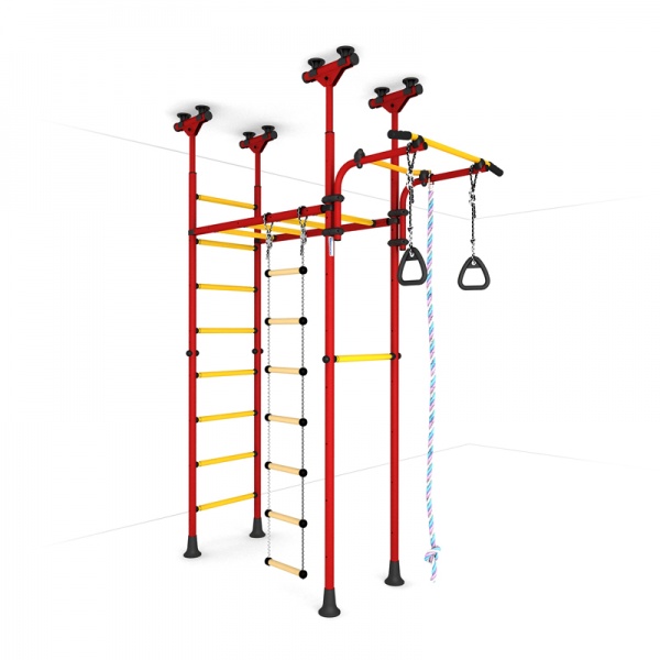 - Функциональность – в процессе оснащения шведской стенки применяются разнообразные спортивные снаряды: турники, гимнастические кольца, канаты, лестницы и прочее. Сбоку можно повесить баскетбольное кольцо, качели, установить горку или закрепить боксерский мешок.