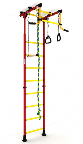 - Функциональность – в процессе оснащения шведской стенки применяются разнообразные спортивные снаряды: турники, гимнастические кольца, канаты, лестницы и прочее. Сбоку можно повесить баскетбольное кольцо, качели, установить горку или закрепить боксерский мешок.