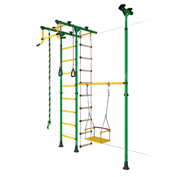 - Функциональность – в процессе оснащения шведской стенки применяются разнообразные спортивные снаряды: турники, гимнастические кольца, канаты, лестницы и прочее. Сбоку можно повесить баскетбольное кольцо, качели, установить горку или закрепить боксерский мешок.