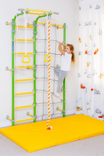 Стенка с очень удачным расположением, отличный вариант детского уголка. Можно цепляться по бокам стенки, лазать по потолку и виснуть на канате. Сын в восторге.
