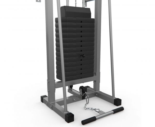 - Со встроенным весом – в них используются плоские грузы, закрепленные с помощью фиксаторов на тросах. Благодаря движению утяжелителей "вверх-вниз" отлично прорабатываются мышцы. Единственный недостаток – целенаправленная работа только с одной группой мышц.