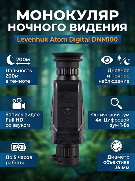 Купить монокуляр ночного видения для охоты Levenhuk Atom Digital DNM100 по эксклюзивной цене от официального дилера. Профессиональные консультации.