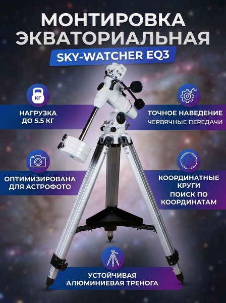 Прочитайте полный обзор, ознакомьтесь с отзывами владельцев EQ3 с алюминиевой треногой, просмотрите описание с характеристиками и фото. Sky-Watcher - это отличный выбор!
