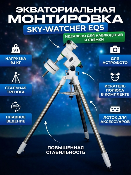 Прочитайте полный обзор, ознакомьтесь с отзывами владельцев EQ5, просмотрите описание с характеристиками и фото. Sky-Watcher - это отличный выбор!