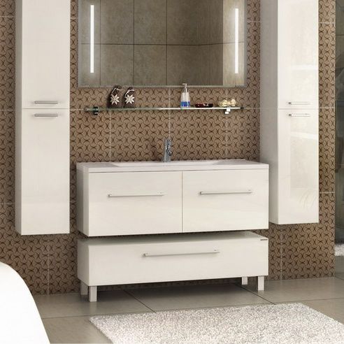На дне ящиков расположены антискользящие коврики. Зеркальный шкаф, внутри которого установлены стеклянные полочки, оснащен дополнительной подсветкой. Универсальный дизайн в белом цвете подходит любому современному интерьеру – в этом вы можете не сомневаться.