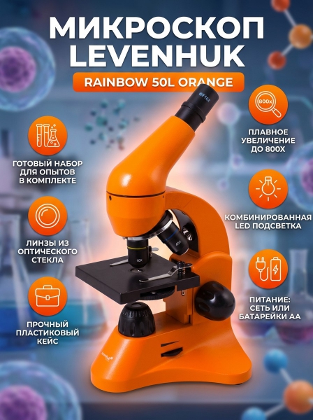 Купить оптический микроскоп Levenhuk Rainbow 50L Orange/Апельсин по эксклюзивной цене от официального дилера. Профессиональные консультации.