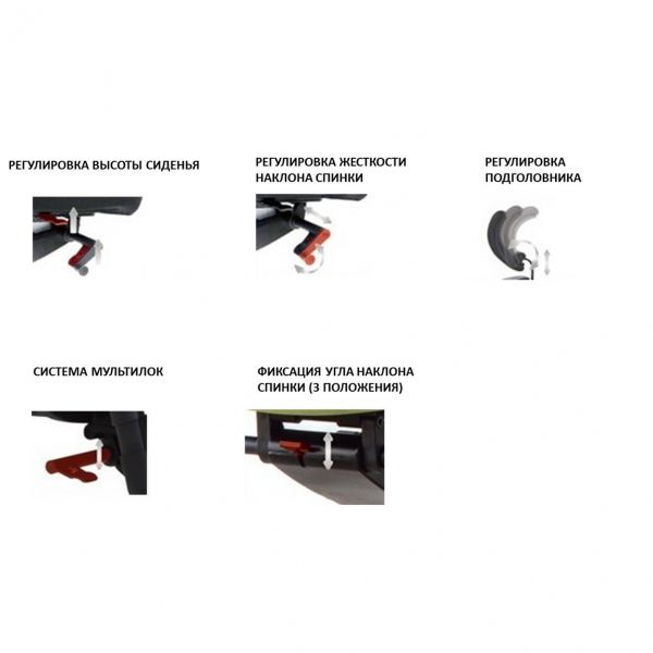 | Регулировка: | регулировка высоты и угла поворота подголовника, регулировка поясничного упора, регулировка угла наклона спинки (4 позиции), регулировка жесткости наклона спинки, сиденье-слайдер, ограничение наклона спинки Shock protection в 3х позициях, 3D подлокотник, регулировка высоты сиденья |