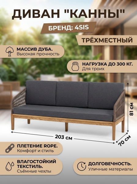 Диван 4SIS "Канны" трёхместный, роуп коричневый круглый, ткань темно-серая 027 - Характеристики