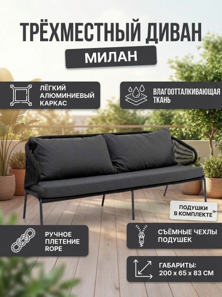 Купить диван для дачи и сада 4SIS "Милан" трёхместный, роуп темно-серый круглый, ткань темно-серая 027 по эксклюзивной цене от официального дилера. Профессиональные консультации.