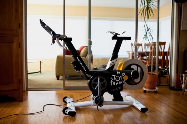 | Тренажер имитирует езду на профессиональном велосипеде по улице. | |