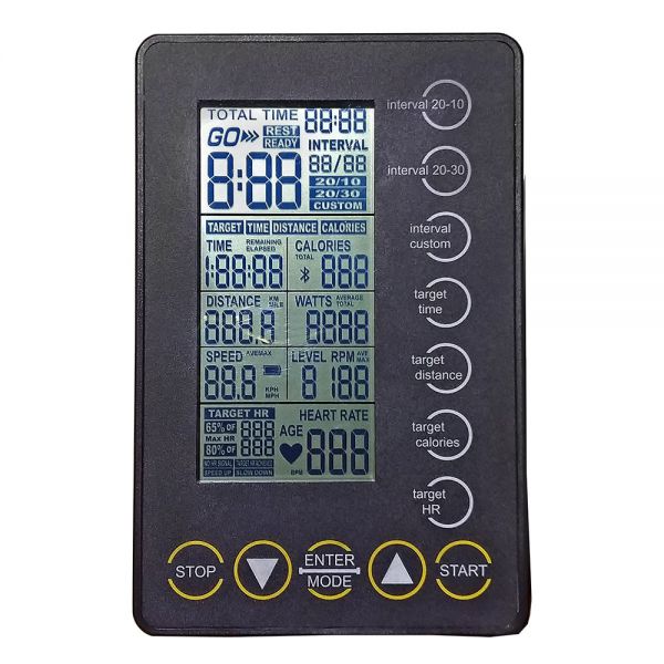 | Показатели консоли: | общее время, время тренировки, расход калорий, расстояние, ватты, скорость, обороты в минуту, ЧСС |