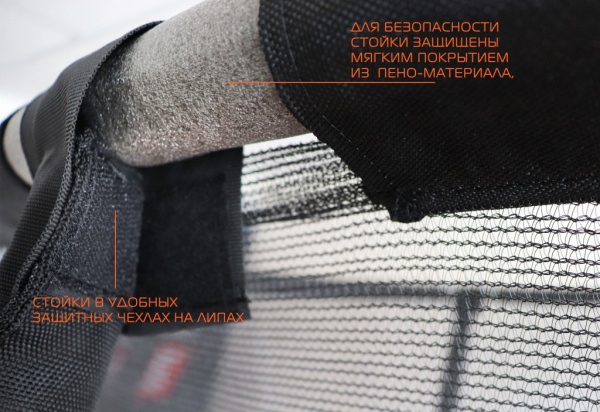 | Держатели сетки: | профиль Ø 25, толщина стенки 1.2 мм, 6 стоек для сетки в защитных чехлах из прочной чёрной ткани, с застежками-фиксаторами на липе |
