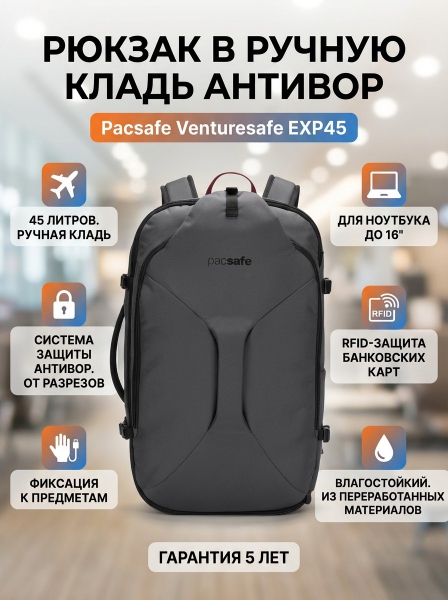 Рюкзак в ручную кладь антивор Pacsafe Venturesafe EXP45 темно-серый - Доставка