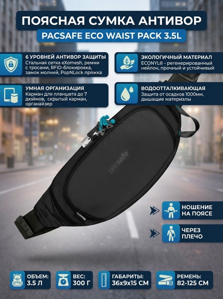 Поясная сумка антивор Pacsafe Eсо waist pack 3.5 л черный ECONYL - Доставка