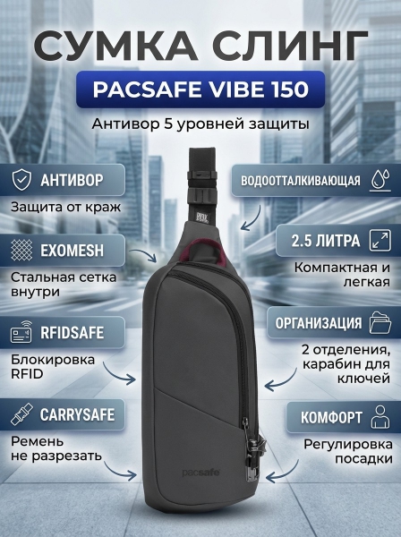 Прочитайте полный обзор, ознакомьтесь с отзывами владельцев Vibe 150 серый, просмотрите описание с характеристиками и фото. Pacsafe - это отличный выбор!