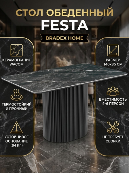 Стол BRADEX HOME Festa, керамогранит Wacom (глянец), черный - Описание