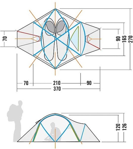 | Размеры внешней палатки (ДхШхВ): | 370 см x 270 см x 126 см |