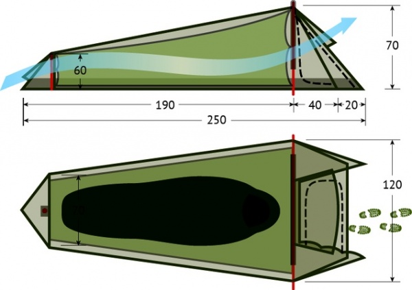 | Размеры внешней палатки (ДхШхВ): | 250x120x70 см |