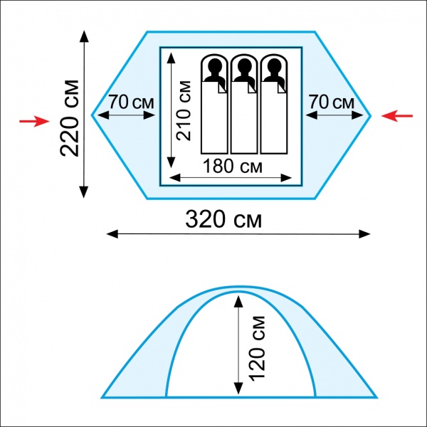 | Размер внешней палатки (ДхШхВ): | 320 см x 220 см x 120 см |