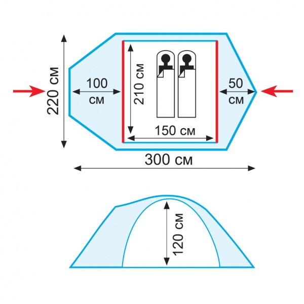 | Размер внешней палатки (ДхШхВ): | 300 см x 220 см x 120 см |